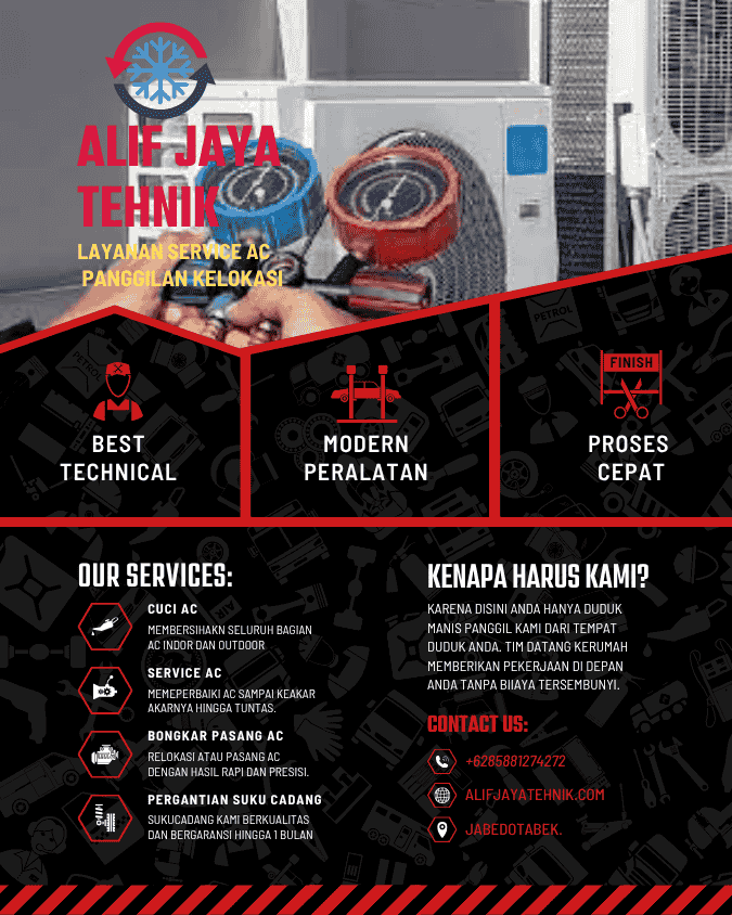 Apakah Anda mencari jasa service AC, cuci AC, atau bongkar pasang AC yang profesional dan terpercaya? Alif jaya teknik siap membantu Anda. Kami adalah penyedia layanan AC terkemuka dengan pengalaman bertahun-tahun dalam industri ini. Dengan tim teknisi yang terlatih dan berpengalaman, kami menyediakan layanan berkualitas tinggi untuk memastikan kenyamanan rumah atau bisnis Anda.